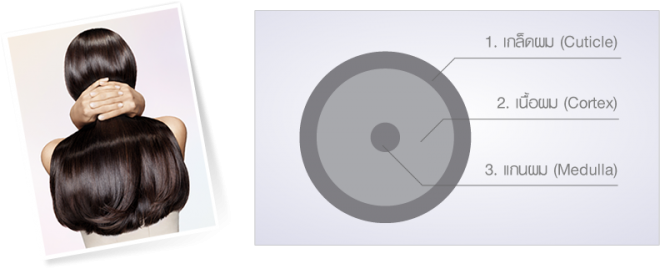 | เกล็ดผม เกล็ดผมคือชั้นนอกสุดของเส้นผม ประกอบขึ้นจากเซลล์เคราตินที่เรียงซ้อนกัน หลายชั้น หน้าที่หลักของเกล็ดผมคือปกป้อง เนื้อผมจากการถูกทำลาย สภาวะของเกล็ดผม มีผลต่อความแข็งแรงของเส้นผม เนื่องจาก เกล็ดผม เป็นส่วนที่เรามองเห็นและสัมผัส และเป็นตัวกำหนดลักษณะของเส้นผม เช่น ความเรียบลื่น ความเงางาม และความยาก ง่ายในการจัดทรง เมื่อเกล็ดผมถูกทำลาย ผมจะดูไม่เงางาม แห้งเสีย และชี้ฟู เกล็ดผม สุขภาพดี จึงเป็นหัวใจสำคัญสู่การมีผมสวย |